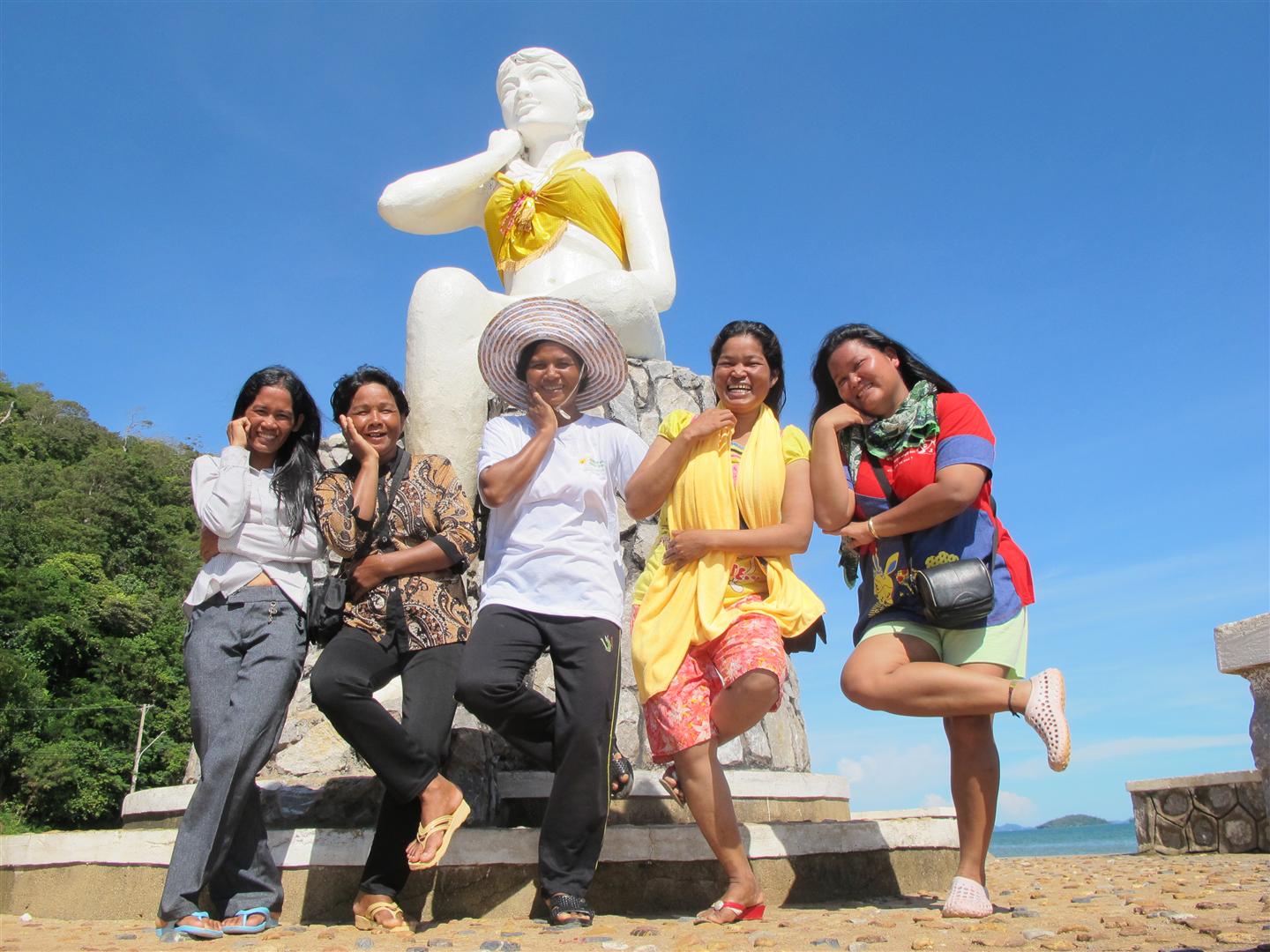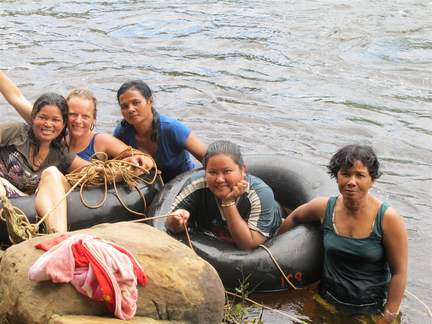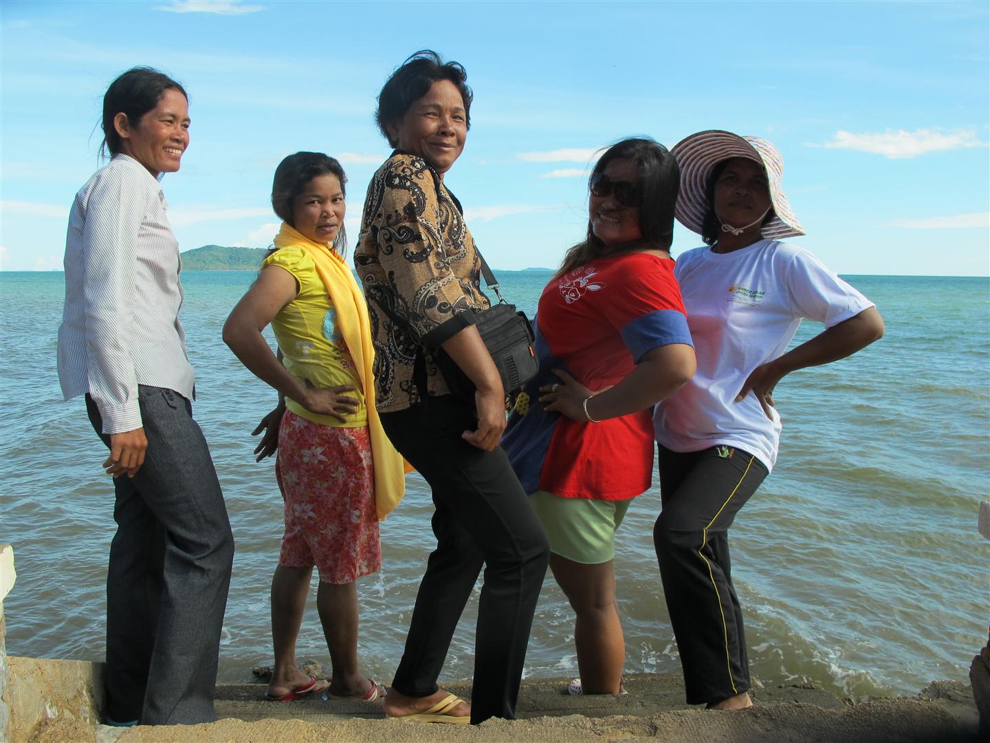 Wat was dit een geweldig weekend. Ik wil het kort houden, maar het wordt lastig……stel je eens voor dat je met 6 vrouwen op pad gaat, waarvan er 4 bijna nog nooit uit hun dorp zijn geweest, in een houten hutje wonen, zonder inboedel, altijd aan het zorgen zijn en 2 dollar per dag te besteden hebben met hun hele gezin….Doordat ik elke vrije minuut die ik heb doorbreng om Cambodja te verkennen, vond ik het tijd om hen ook een kleine Cambodja ervaring te geven. We zijn naar Kep, een kleine kustplaats en Kampot een plaatsje aan een mooie rivier met uitzicht op de bergen geweest. Het leek wel een schoolreisje….Van elke minuut werd dankbaar genoten en elke minuut werd er weer iets nieuws geleerd. Hoe je je gordel om moet doen als je eenmaal uit hebt gevonden hoe de deur van de auto open moet, dat de zee zout is, sta je zelf niet meer bij stil, maar Sauwi en Seeng wisten dat niet, daarom werden er liters zeewater mee naar huis genomen. Dat je de wc kan doorspoelen met een knopje…nog nooit van gehoord en dat een matras eigenlijk beter voor je rug is…geen idee.